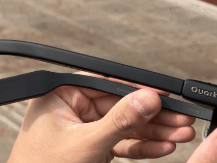 为了把镜腿做得更细,眼镜的电池被安排在了镜腿尾部,左右腿各一个。调整眼镜重心的同时,右侧的电池还被巧妙地设计成了可插拔的「换电」功能,日常使用中能够快速地延长续航时间。