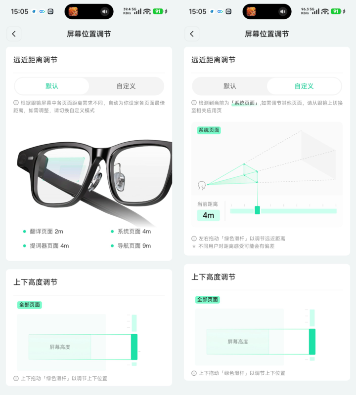 超细镜腿压缩了显示光机的空间,但夸克还是通过定制方案实现了双目双光机,亮度最高可达 4000nits,实测在户外确实清晰可见。比较特别的是合像距可调节功能,可以在手机 App 中自定义不同功能界面的「显示距离」。