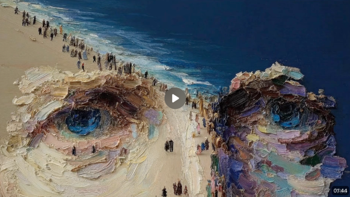 当我看着满屏的动态油画时,说实话,根本没想到这是否通过 AI 生成。一方面是对油画艺术的不了解,是否有相关的技术,或者爱好者在专门做类似的工作。另一方面,大多数时候,我们所说的 AI 味,主要是在制作一些写实的画面,像现实世界、真人版等。而这种风格化本身就足够突出的内容,AI 的处理反而不会太突兀。